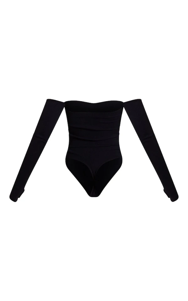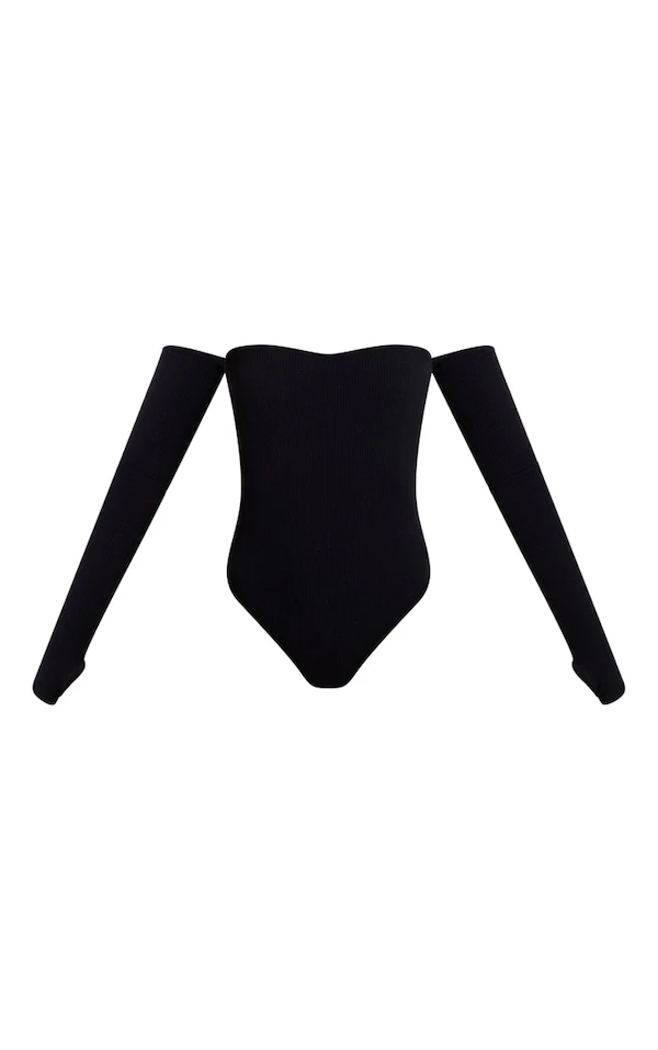 Body col bardot côtelé noir à détail contours et trous pour les pouces