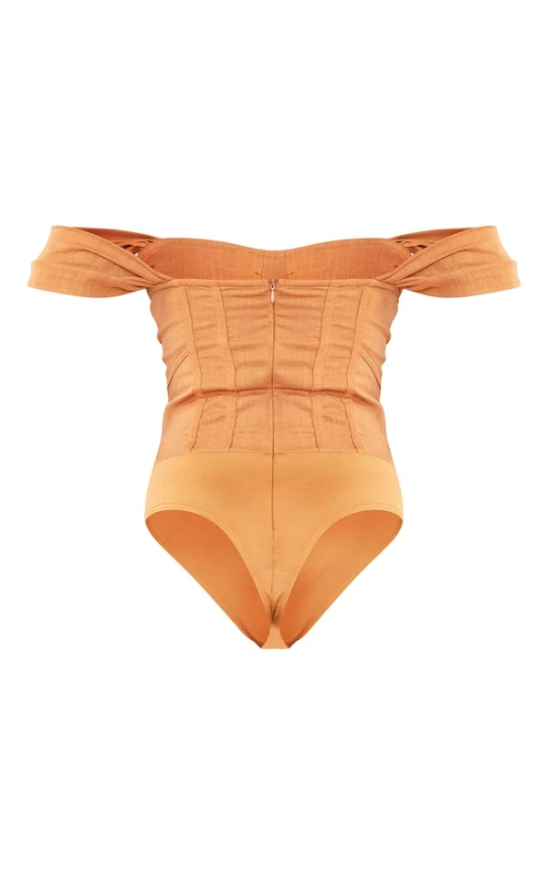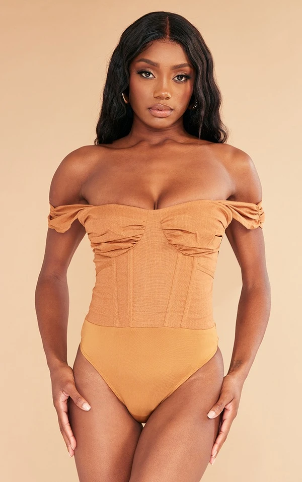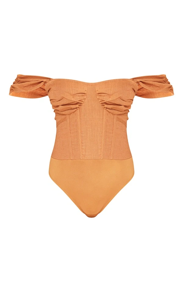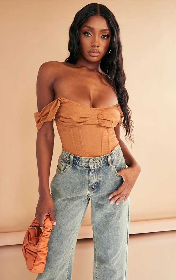 Canonissime, ce body corset ! Avec sa couleur café au lait délicieuse, son effet lin et son design à buste drapé, comment ne pas craquer ? Portez-le avec un jean bleu clair délavé et une paire de talons transparents. So easy !