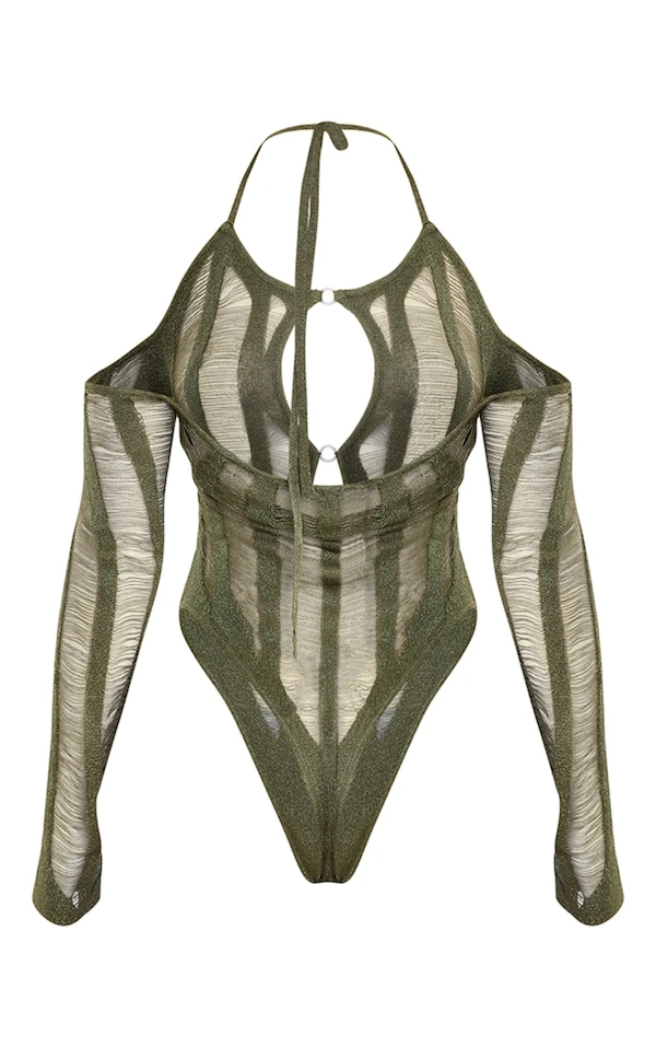 Direct dans le panier ce body ! On adore sa couleur kaki, sa maille tricot ajourée et le détail de son anneau. Portez-le avec un pantalon large et une paire de talons pour finaliser votre look du jour. Vous êtes sensationnelle !