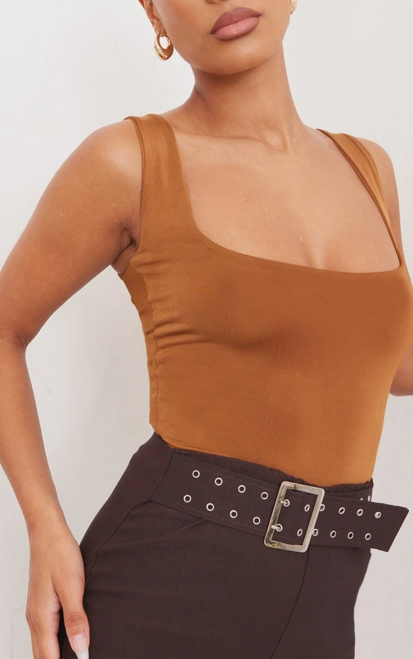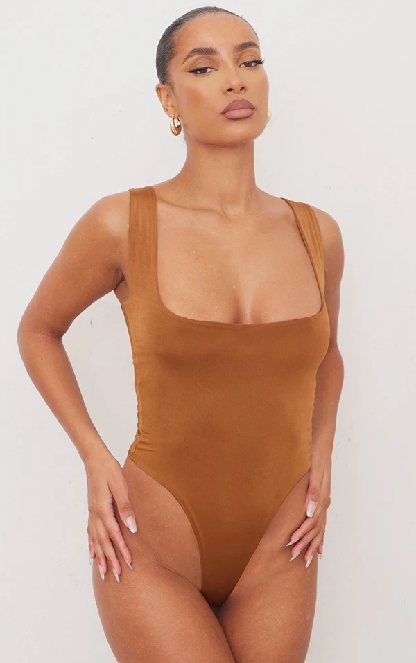 Sublime & divine dans ce body ! On adore son col rond, sa coupe moulante et son coloris camel très gourmand. On porte ce body avec un pantalon marron et des mules assorties. Charmante, ravissante, renversante !