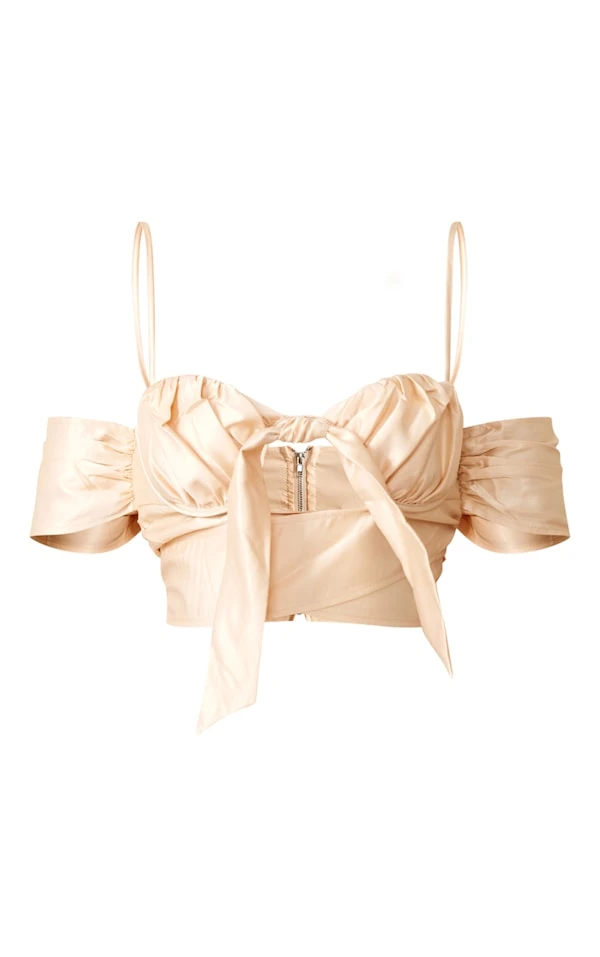 Bralette satinée champagne à col bardot avec noeud et buste froncé