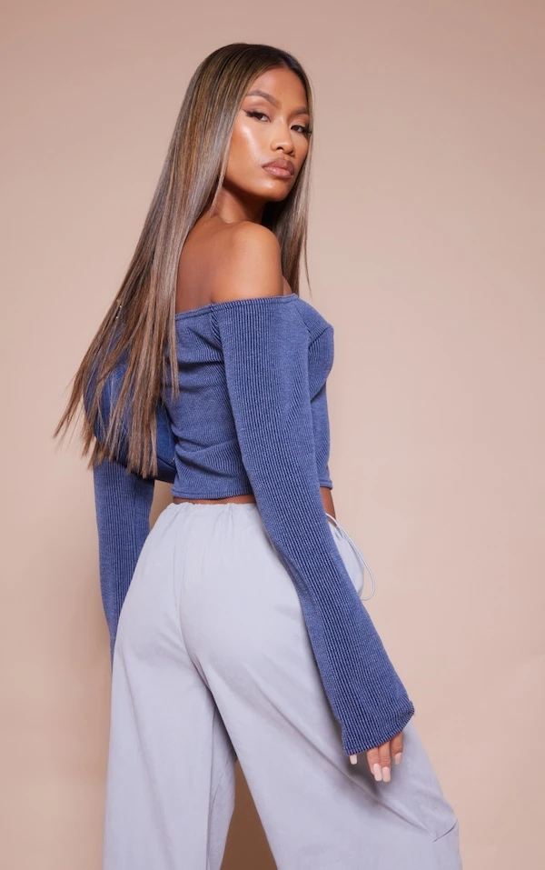 Crop top bleu en maille côtelée contrastante et col bardot