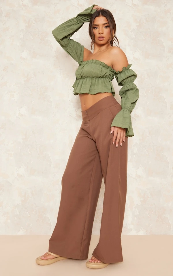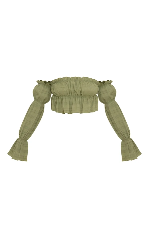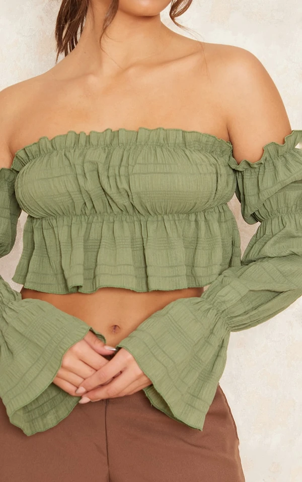 Crop top col bardot texturé volanté kaki