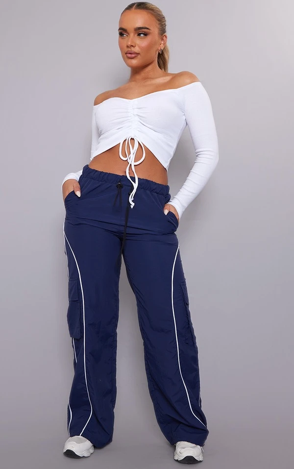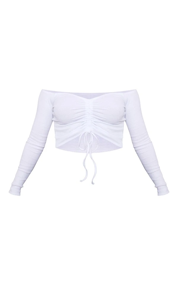 Crop top côtelé blanc à col bardot froncé devant