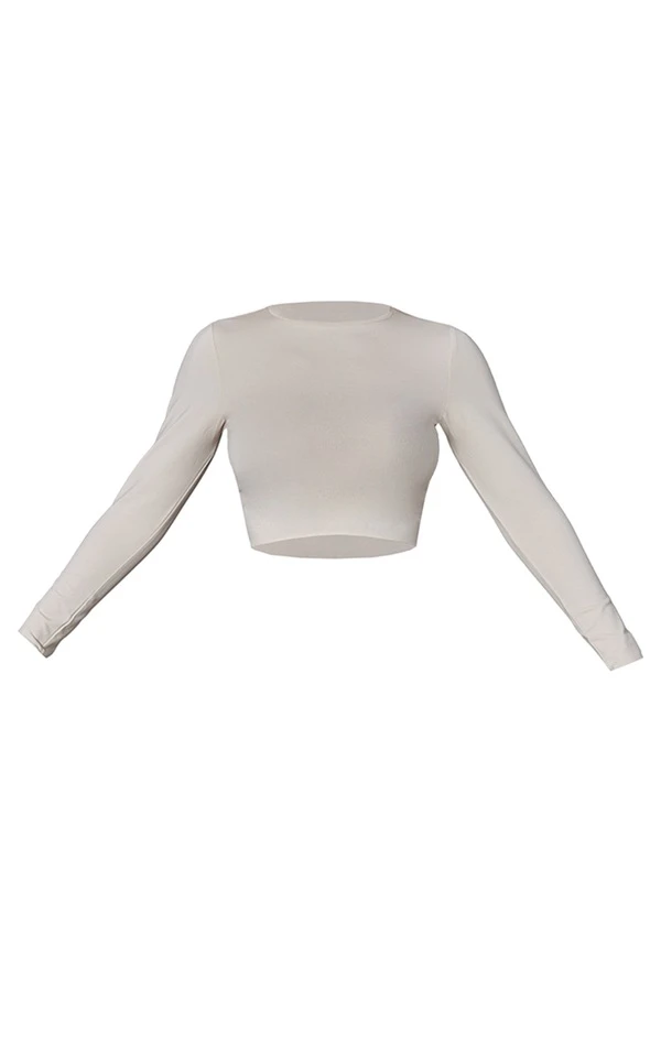 Crop top en coton gris pierre à ourlet légèrement volanté et manches longues