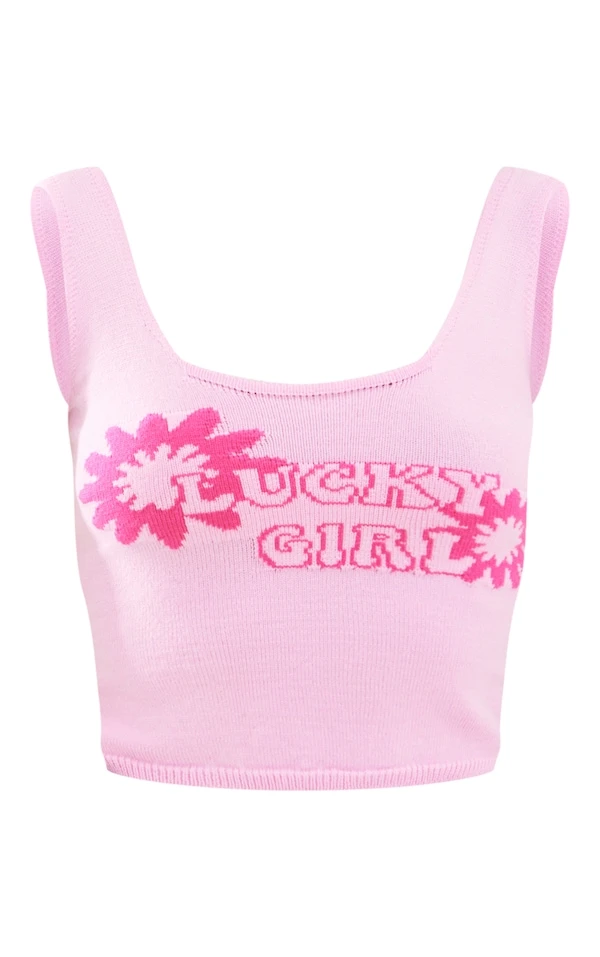 Débardeur en maille tricot rose tendre à slogan Lucky Girl