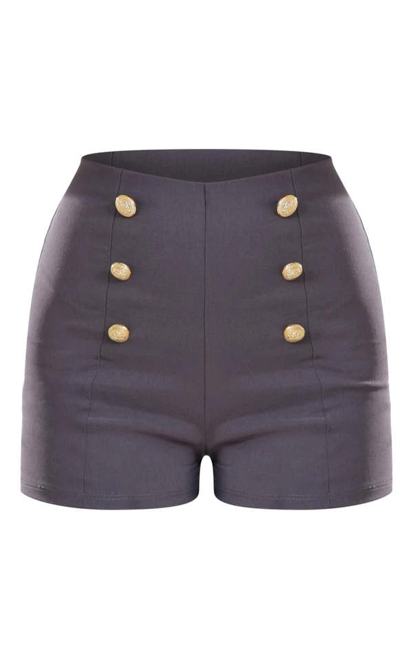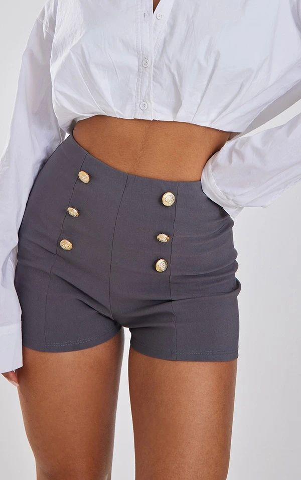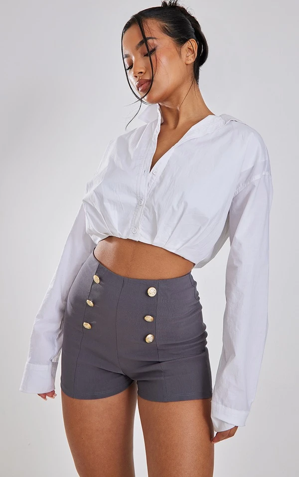 On est complètement in love de ce mini short ! Avec sa couleur gris anthracite qu’on sur-love et son design à boutons canon, difficile d’y résister. Porté avec une chemise courte oversize et des talons hauts, le look est juste parfait. What a babe !