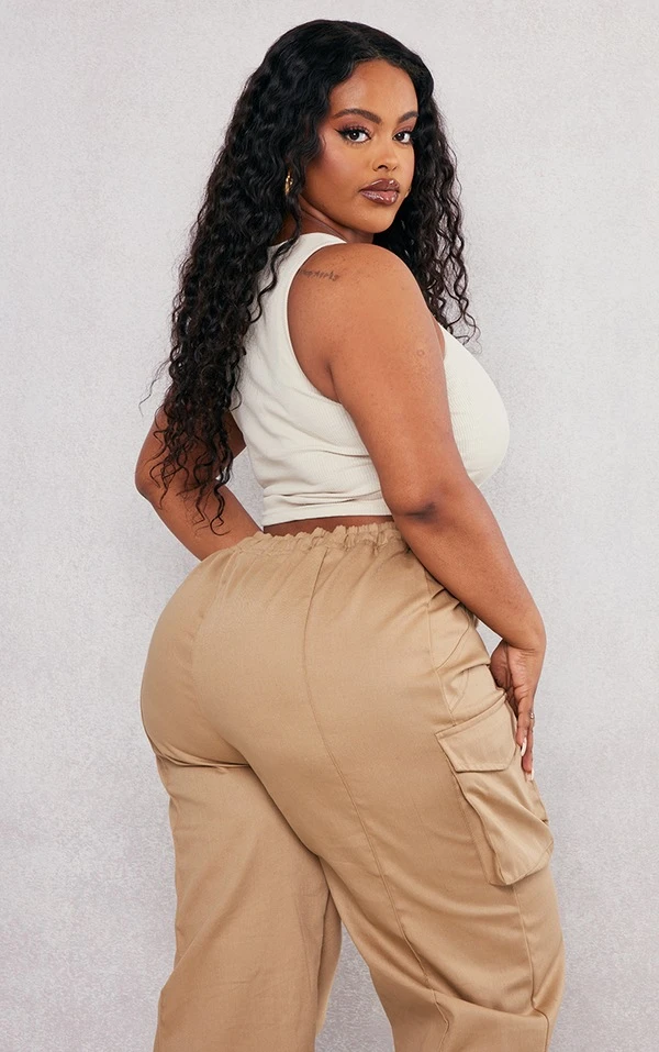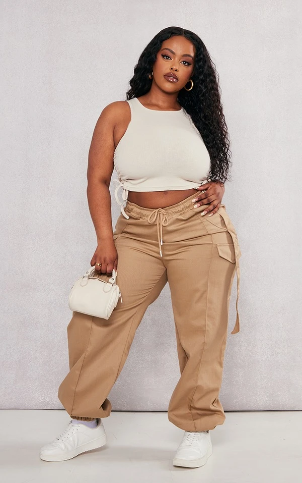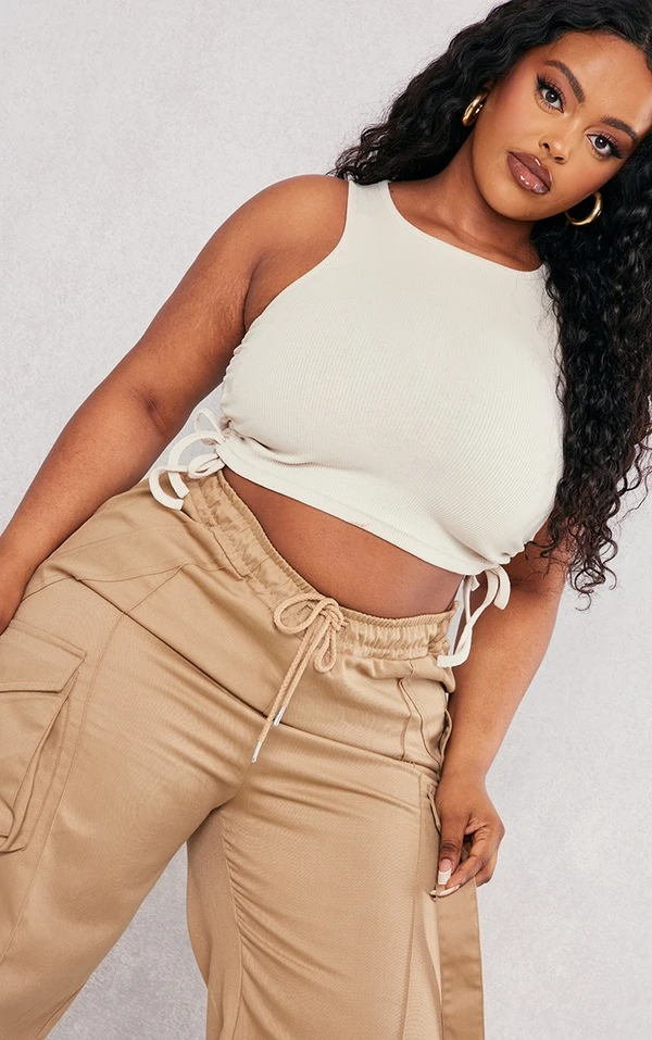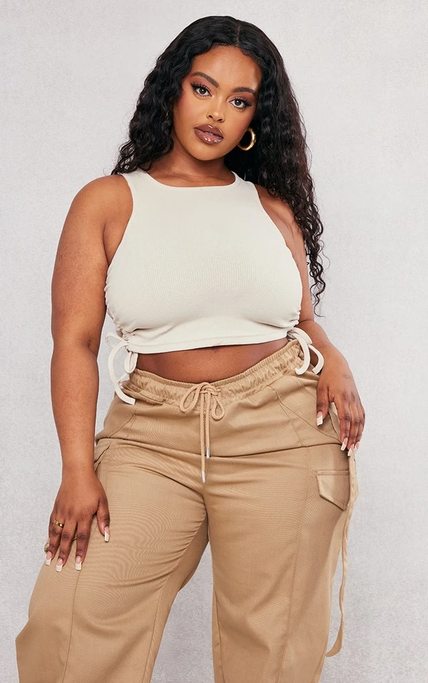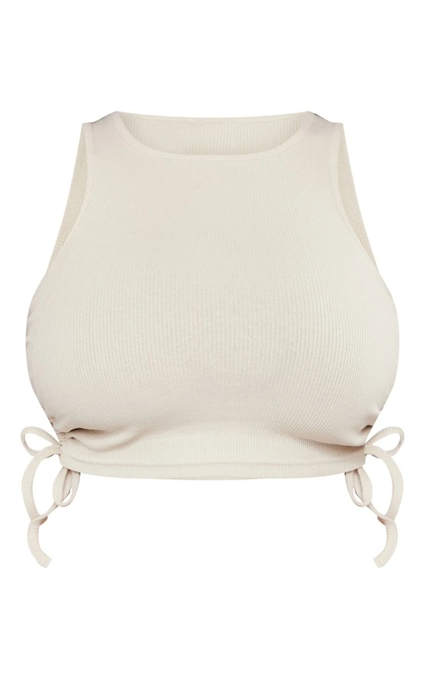 Plus débardeur court froncé côtelé gris pierre à cordons ajustables