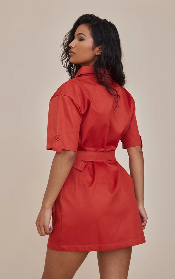 Robe Chemise Cargo Rouille Ceinturée à Manches