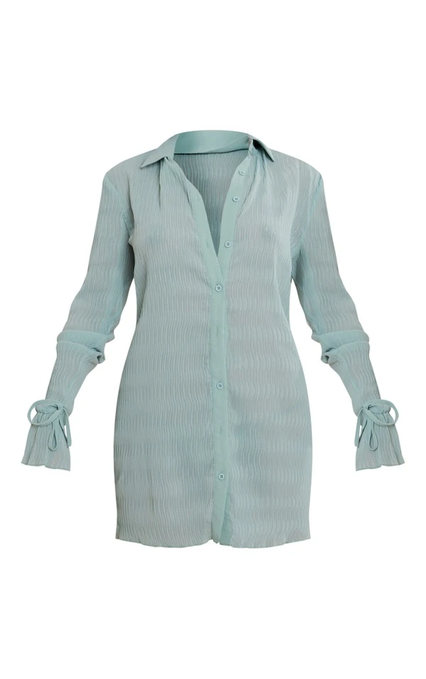 Robe Chemise En Mousseline De Soie Vert Sauge Texturée Transparente à Manchettes évasées