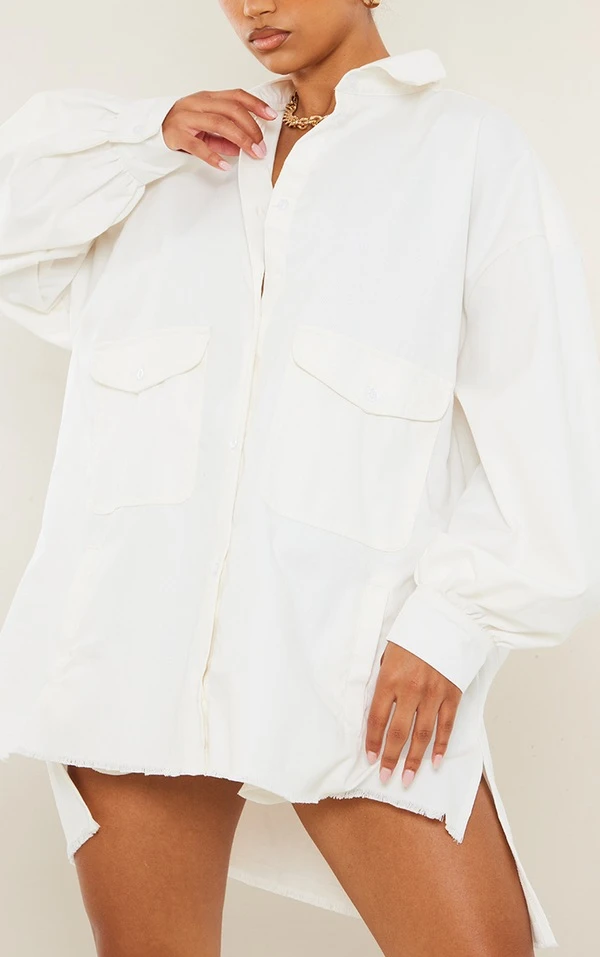 Robe chemise oversize en maille sergée blanche à ourlet élimé et boutons