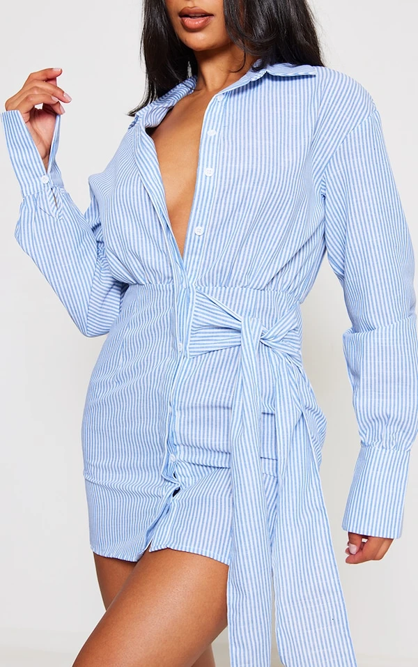 Robe chemise rayée bleu clair à boutons et noeud