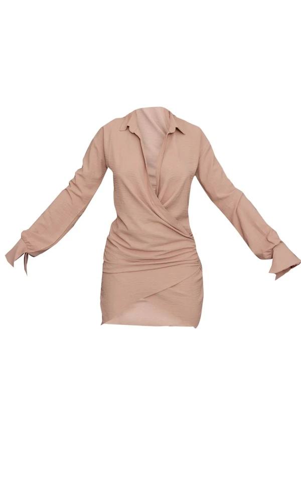 Robe Chemise Tissée Taupe Texturée Très Décolletée à Manchettes évasées