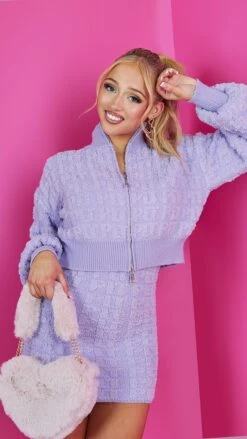 Robe courte en maille tricot effet ondulé lilas fleurie