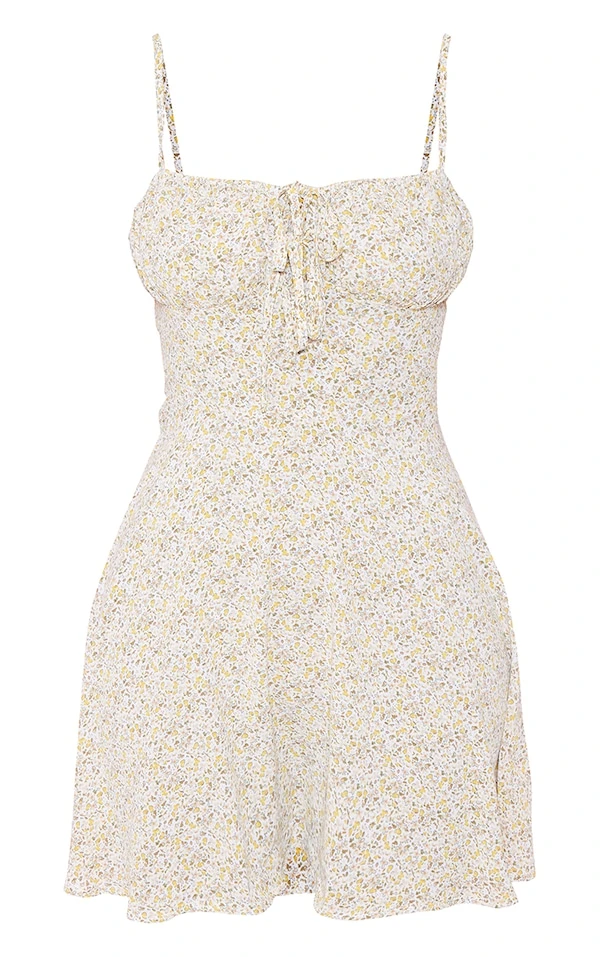 Robe droite orange imprimé petites fleurs à bretelles et devant noué