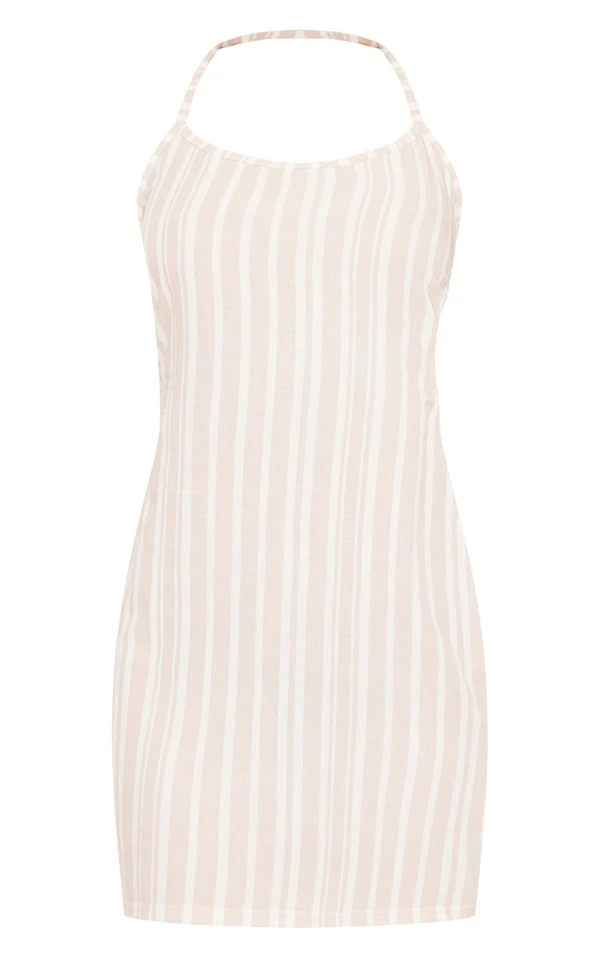 Robe T-shirt droite en effet lin beige rayé découpée à nouer derrière