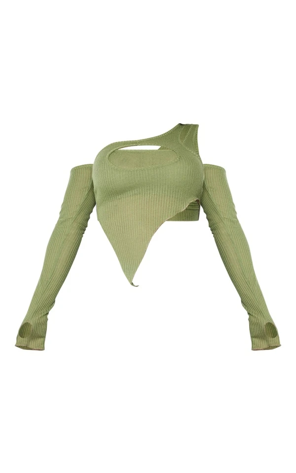 Shape Crop top asymétrique côtelé transparent kaki à épaules dénudées
