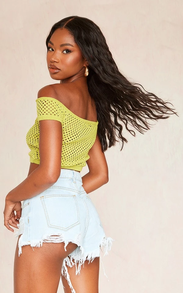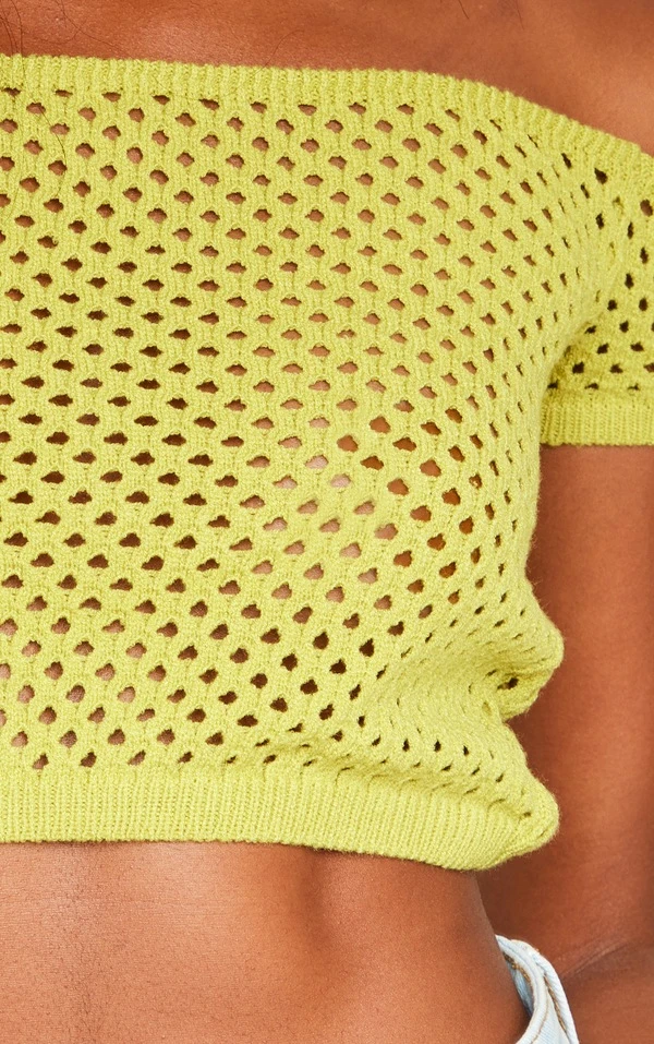 Top en maille tricot douce ajourée vert citron à épaules dénudées