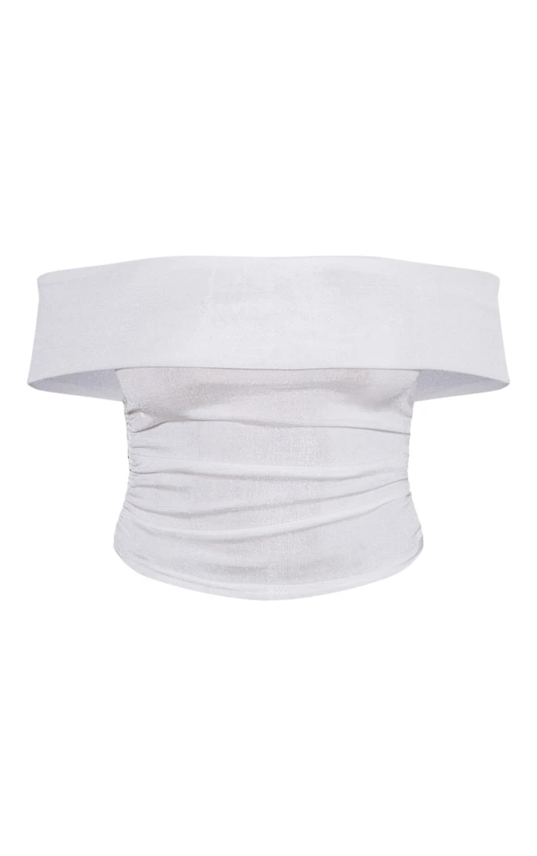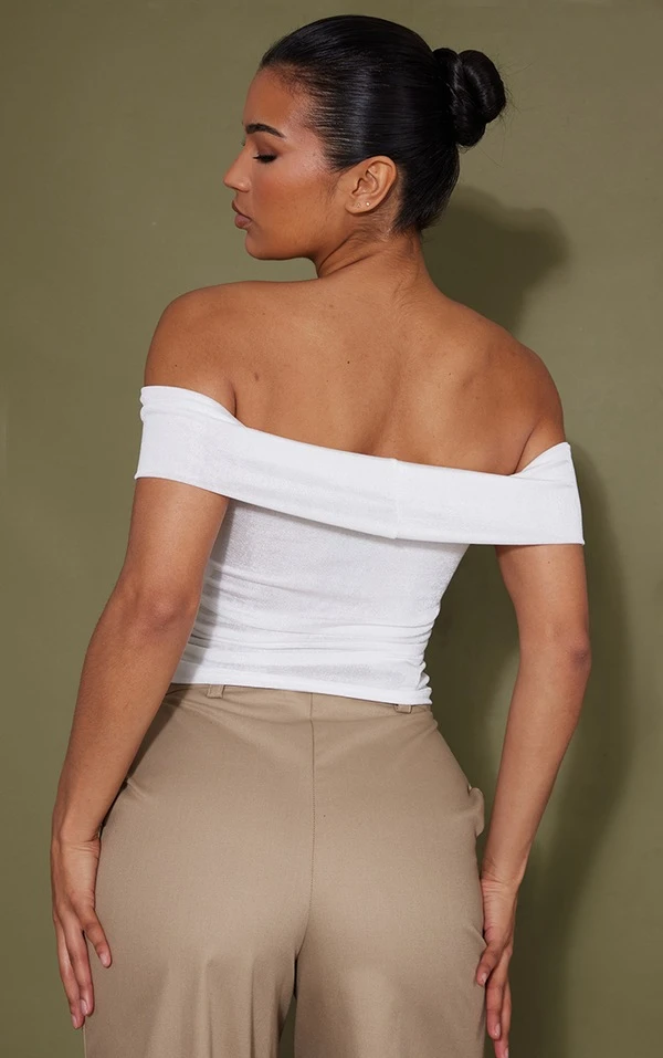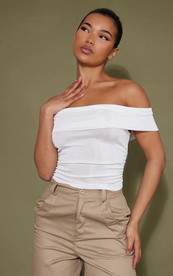 Incroyable ce top à la coupe moulante flatteuse ! On est hyper fans de sa matière en acétate blanche et son col bardot replié. Pour un flow bien validé, on enfile un pantalon large beige et une paire de baskets blanches. La reine du style, vous !