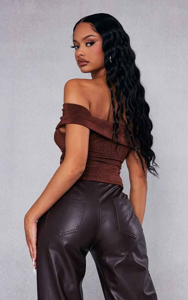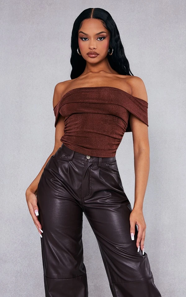 Coup de coeur immédiat sur ce top ! Avec sa coupe moulante qui vous met en valeur, sa couleur chocolat délicieuse et sa matière en acétate, comment résister ? On aime le porter avec un pantalon large en similicuir noir et quelques accessoires. Easy, non ?